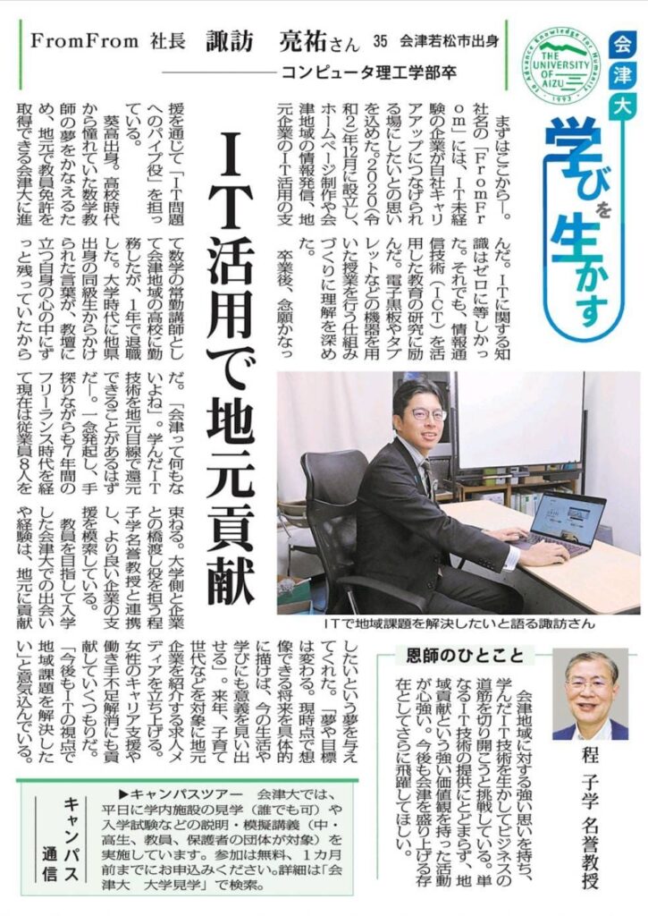 株式会社FromFrom代表取締役 諏訪亮祐(会津大学卒)が、2025年12月13日付の「福島民報(会津版)」に、会津大学卒業生のインタビュー記事として掲載されました。